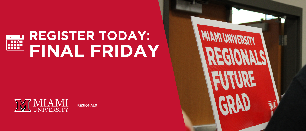 Fall semester is starting soon! At Final Friday, you can drop in anytime - in person at the Hamilton or Middletown campus to complete your next steps for enrollment.- The Miami Regionals community will be available to help you login to myMiami, complete orientation, and take your placement test (if applicable).